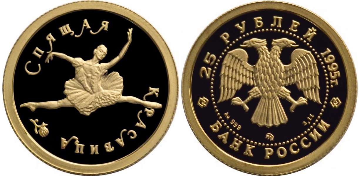 Золотая монета Спящая красавица (Танцующая балерина) – Русский балет 3.11 г чистого металла, 25 RUB, 1995