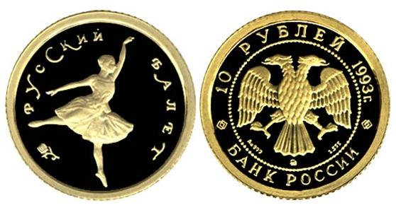 Золотая монета Русский балет. Танцующая балерина – Русский балет 1.55 г чистого металла, 10 RUB, 1993