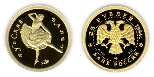 Золотая монета Русский балет. Танцующая балерина – Русский балет 25 RUB, вес чистого металла 3.11 г, 1994