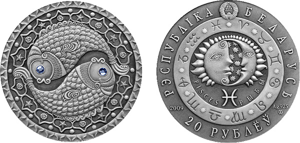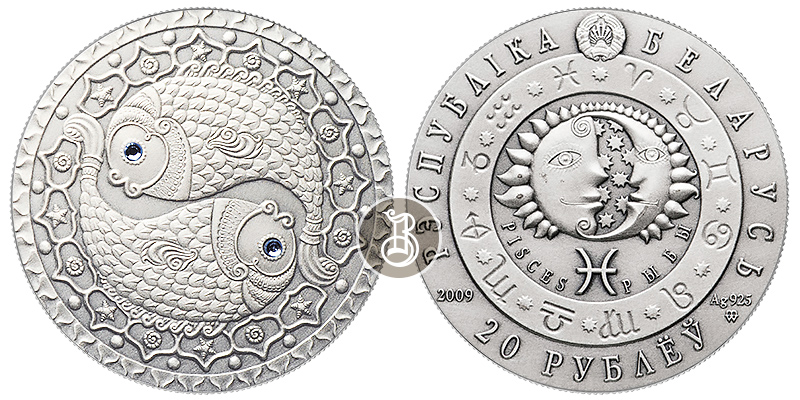 Серебряная монета Рыбы – Знаки зодиака 26.16 г чистого металла, 20 BYR, 2009