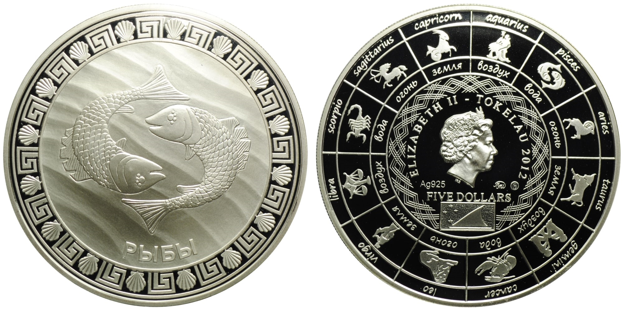 Серебряная монета Рыбы – Знаки зодиака 31.1 г чистого металла, 5 NZD, 2012