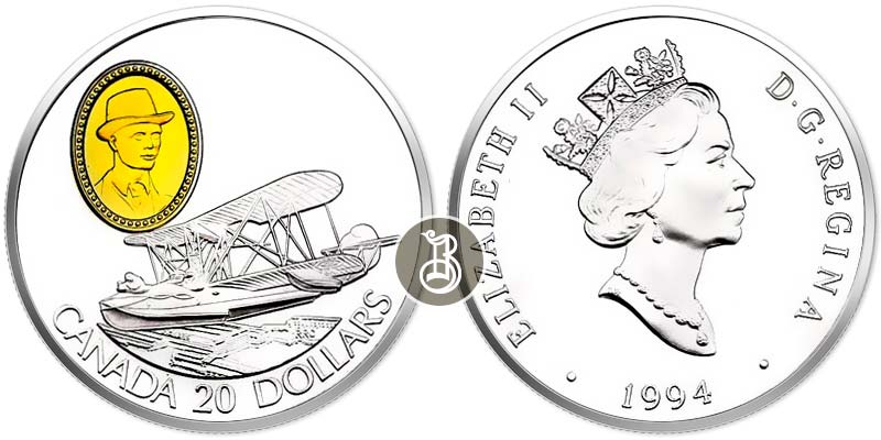 Серебряная с золотом монета Самолет Vickers Vedette. Пилот Вилфред Т.Рейд – Авиация Канады и США 28.77 г чистого металла, 20 CAD, 1994