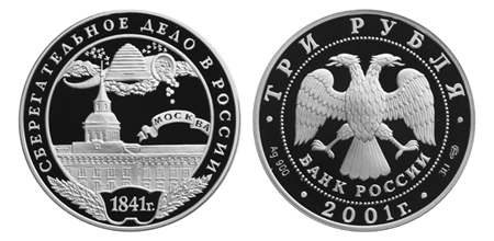 Серебряная монета Сберегательное дело в России (первая московская сберегательная касса) – 31.1 г чистого металла, 3 RUB, 2001