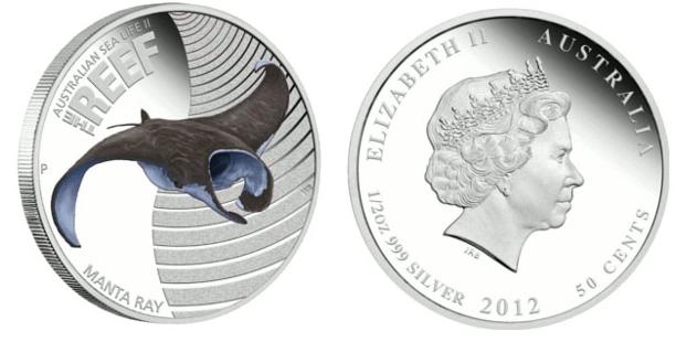 Серебряная монета Скат Манта – Морская фауна Австралии. Риф 15.55 г чистого металла, 0,5 AUD, 2012