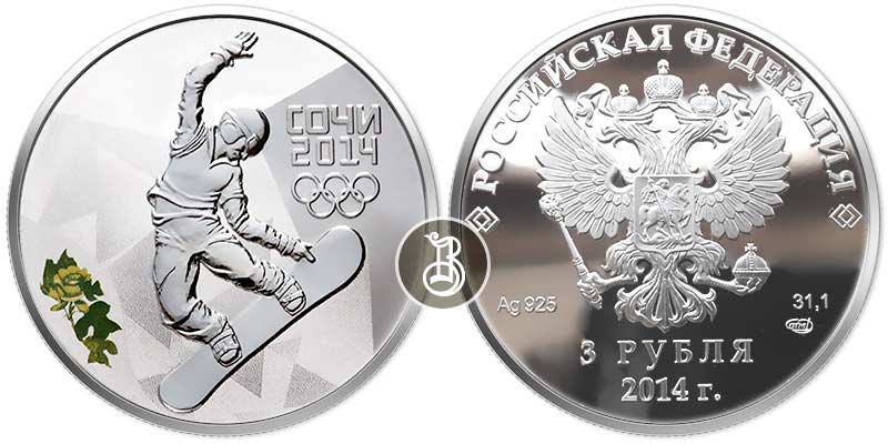 Серебряная монета Сноуборд – XXII Олимпийские зимние игры 2014 г. в Сочи 31.1 г чистого металла, 3 RUB, 2014