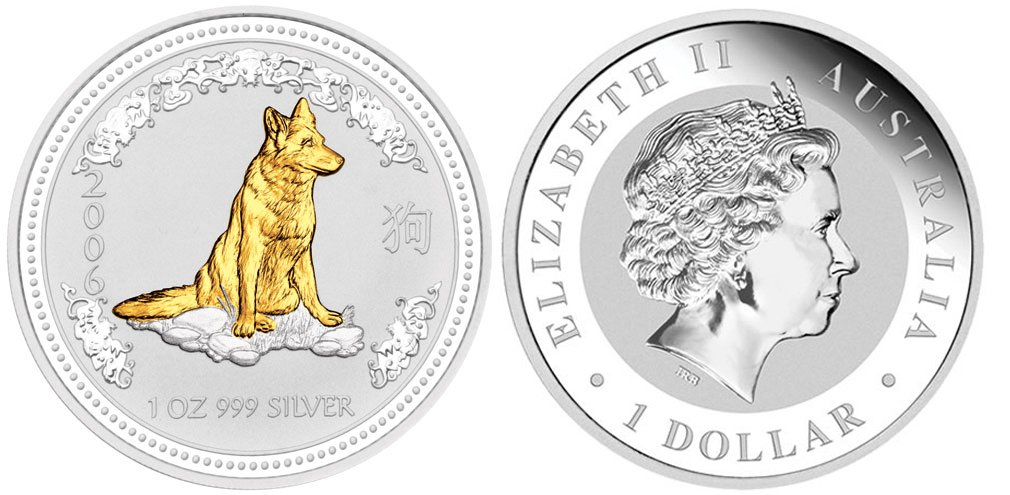 Серебряная с золотом монета Собака – Лунная cерия I 31.1 г чистого металла, 1 AUD, 2006