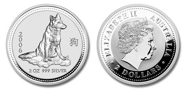 Серебряная монета Австралийский лунар. Год собаки – Лунная cерия I 62.2 г чистого металла, 2 AUD, 2006