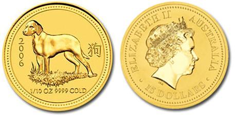 Золотая монета Австралийский Лунар. Год Собаки. 1/10 унции – Лунная cерия I 3.11 г чистого металла, 15 AUD, 2006