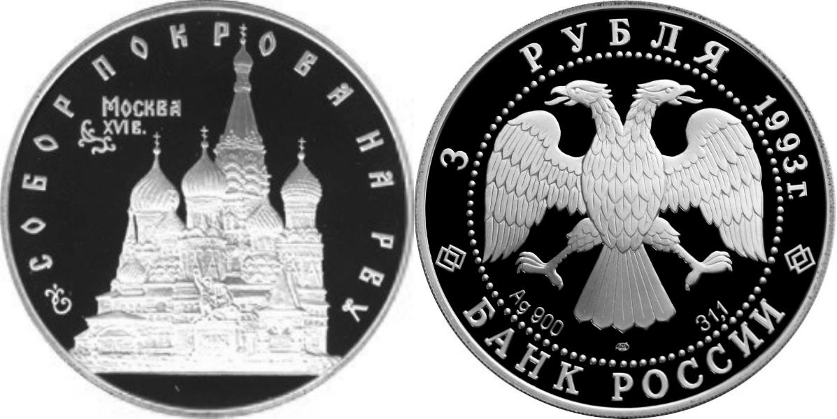 Серебряная монета Собор Покрова на Рву – Памятники архитектуры России 31.1 г чистого металла, 3 RUB, 1993