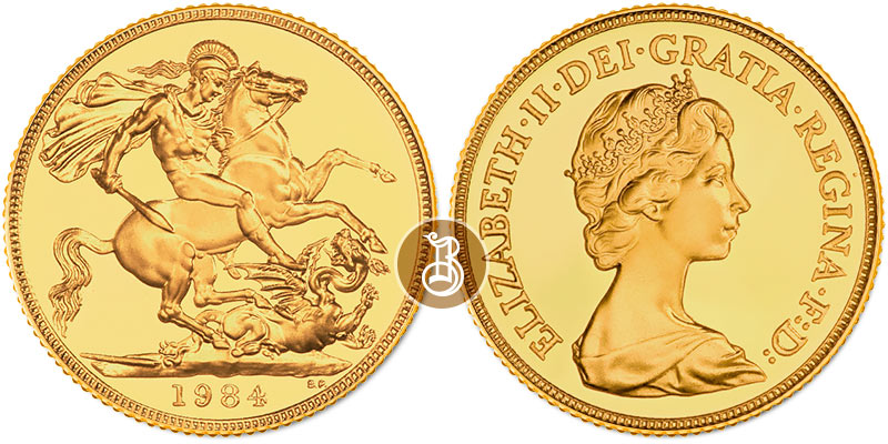 Золотая монета Соверен Елизавета II молодая в короне 1974-1984 – Соверен 7.32 г чистого металла, 1 соверен, 1974