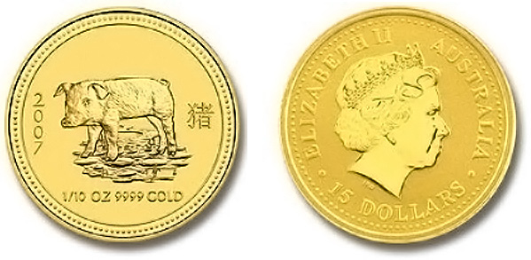Золотая памятная (коллекционная) монета Свинья лунар, золото, 1/10 oz, Австралия, 2007, 3,1 г, (0,1 oz), проба 9999
