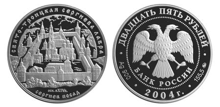 Серебряная монета Свято-Троицкая Сергиева Лавра, г. Сергиев Посад, М – Памятники архитектуры России 155.5 г чистого металла, 25 RUB, 2004
