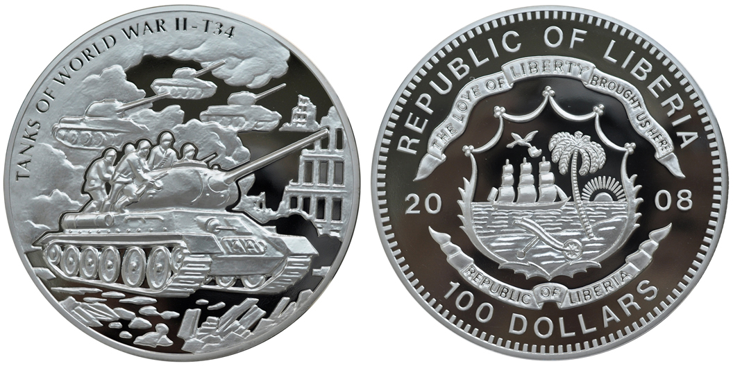 Серебряная коллекционная монета высочайшего качества - «Танки Второй мировой войны» имеющая вес чистого серебра 1000 грамм, что составляет 32 тройские унции и номинал 100 либерийских долларов. Это одна из самых популярных коллекционных монет Либерии. Эта монета является инвестиционной содержащей 99.99% чистого серебра, на которой изображен Танк Т-34. Данный товар подходит как коллекционерам, так и инвесторам, поскольку сочетает в себе красоту и чистоту серебра.