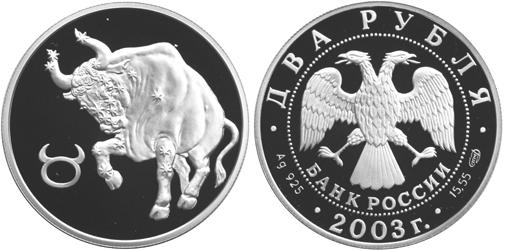 Серебряная монета Телец – Знаки зодиака 15.55 г чистого металла, 2 RUB, 2003