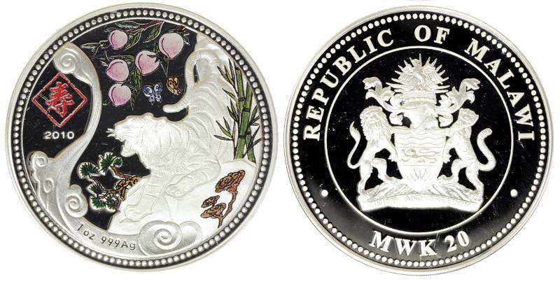 Серебряная монета Тигр Шу (здоровье, долголетие) – Лунный календарь 31.1 г чистого металла, 20 MWK, 2010