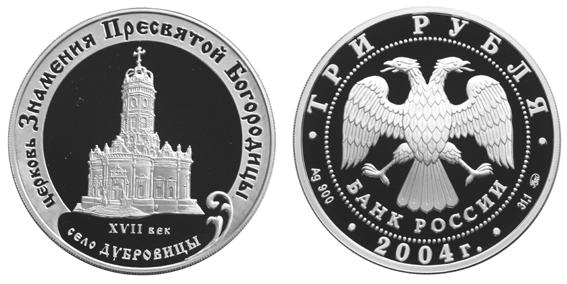 Серебряная монета Церковь Знамения Пресвятой Богородицы, село Дубров – Памятники архитектуры России 31.1 г чистого металла, 3 RUB, 2004