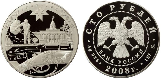 Серебряная монета К 450-летию добровольного вхождения Удмуртии в сос – 1000 г чистого металла, 100 RUB, 2008