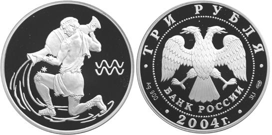 Серебряная монета Водолей – Знаки зодиака 31.1 г чистого металла, 3 RUB, 2004