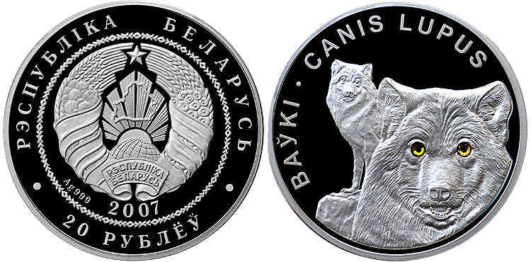 Серебряная монета Волки – Защита окружающей среды 31.1 г чистого металла, 20 BYR, 2007