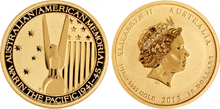 Золотая монета Мемориал Война в Тихоокеанском регионе 1941-1945 – 3.11 г чистого металла, 15 AUD, 2013