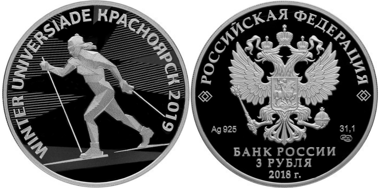 Серебряная памятная (коллекционная) монета Всемирная зимняя универсиада, серебро, 3 рубля, 2018, 31,1 гр., (1 oz), проба 925