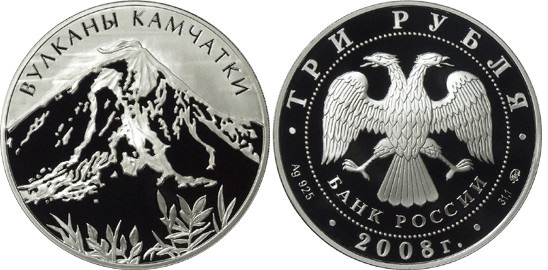 Серебряная монета Вулканы Камчатки – Россия во всемирном, культурном и природном наследии ЮНЕСКО 31.1 г чистого металла, 3 RUB, 2013