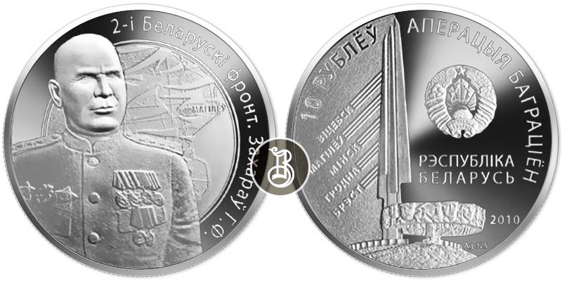Серебряная монета 2-й Белорусский фронт. Захаров Г.Ф. – 15.55 г чистого металла, 10 RUB, 2010