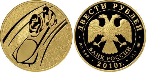 Золотая монета Бобслей – Зимние виды спорта 31.1 г чистого металла, 200 RUB, 2010