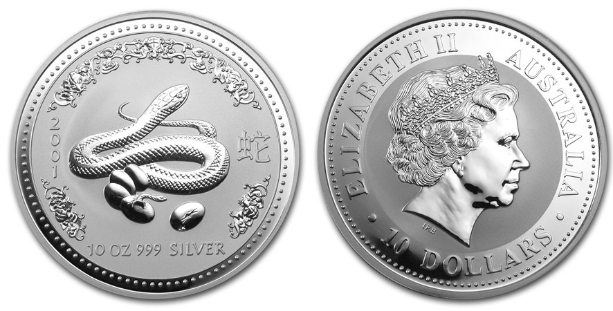 Серебряная монета Лунар Год Змеи.10 унций – Лунная cерия I 311 г чистого металла, 10 AUD, 2001